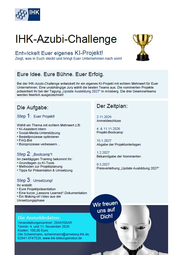 Die IHK-Azubi-Challenge bietet Euch die Möglichkeit, praktische Erfahrung mit Künstlicher Intelligenz zu sammeln und gleichzeitig echten Mehrwert für Euer Unternehmen zu schaffen.